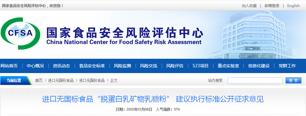受?chē)?guó)家衛(wèi)生健康委員會(huì)委托,根據(jù)《食品安全法》和《國(guó)家衛(wèi)生計(jì)生委辦公廳關(guān)于規(guī)范進(jìn)口尚無(wú)食品安全國(guó)家標(biāo)準(zhǔn)審查工作的通知》要求,對(duì)擬按照進(jìn)口尚無(wú)食品安全國(guó)家標(biāo)準(zhǔn)食品管理的“脫蛋白乳礦物乳糖粉”公開(kāi)征求意見(jiàn),請(qǐng)于20204月5日前將意見(jiàn)反饋至我中心,逾期將不予處理。