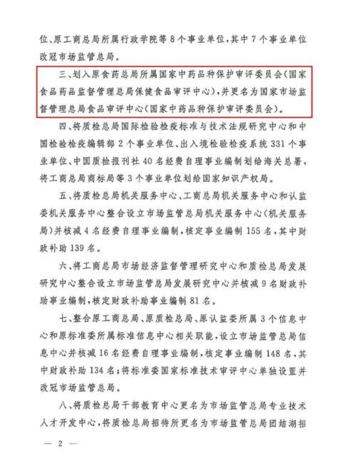 劃入原食藥總局所屬國(guó)家中藥品種保護(hù)審評(píng)委員會(huì)(國(guó)家食品藥品監(jiān)督管理總局保健食品審評(píng)中心),并更名為國(guó)家市場(chǎng)監(jiān)督管理總局食品審評(píng)中心(國(guó)家中藥品種保護(hù)審評(píng)委員會(huì))。